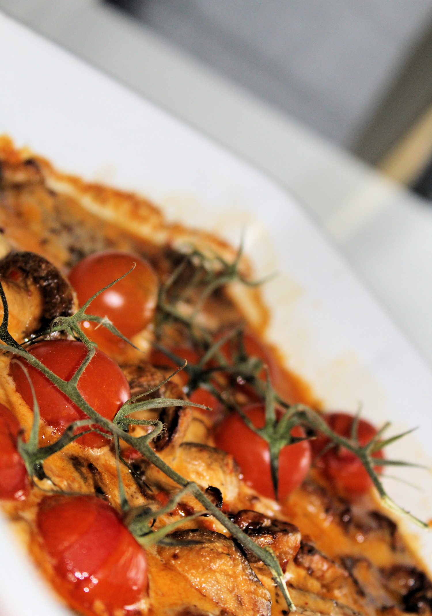 Lägg några kvisttomater över såsen och sätt in i 175 grader i ca 20 minuter. Servera med potatisrosor och en härlig sallad.