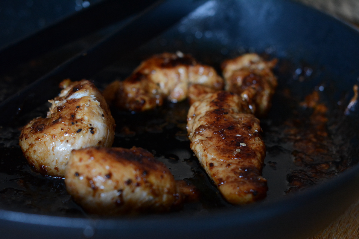 Under tiden stek kyckling på låg värme. Pensla över teriyakisås på båda sidorna. Vänd med jämna mellanrum för att glasera dom väl. Smaka av med salt och peppar.