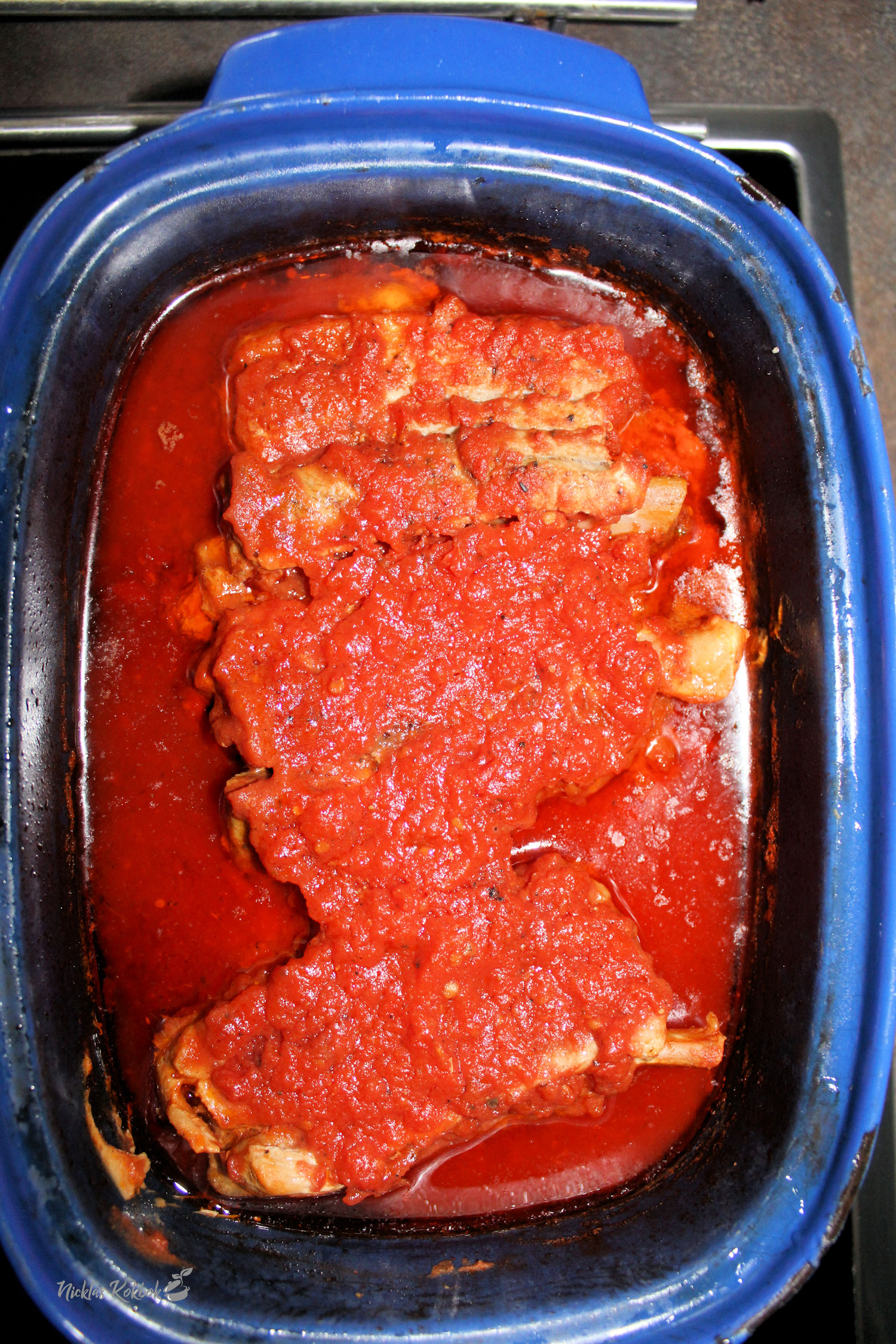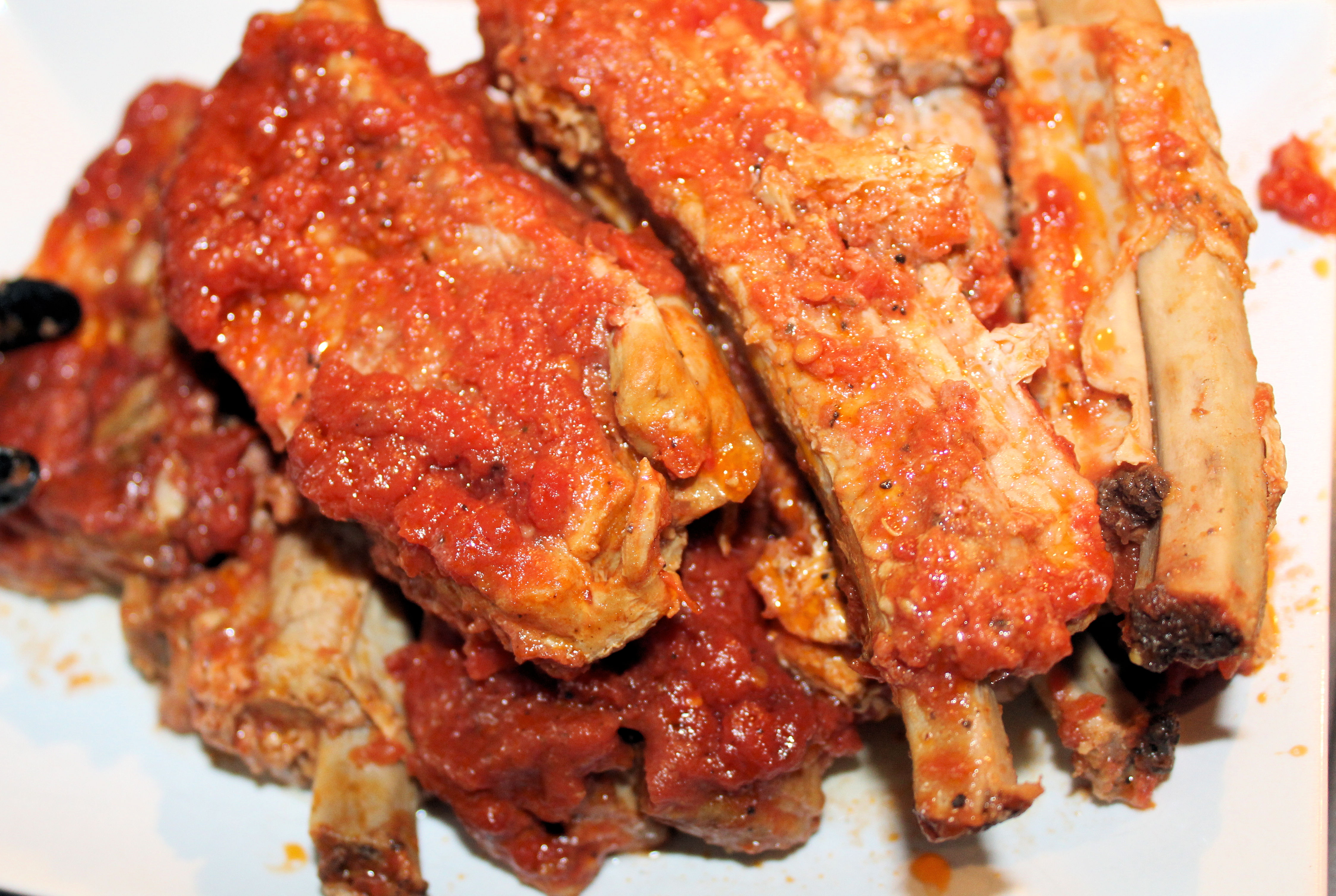Salta revbensspjällen runt om och lägg i gryta. Tillsätt BBQ-såsen och koka 2 timmar på låg värme.