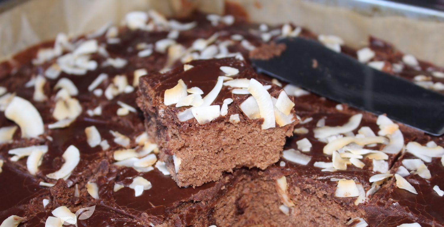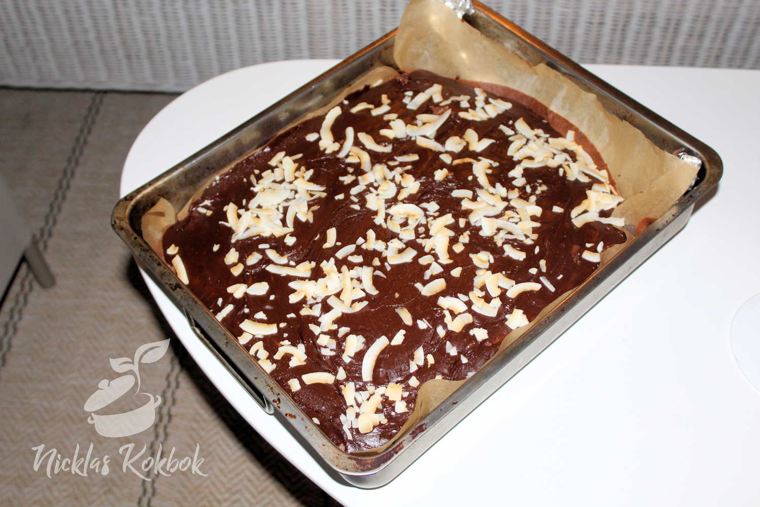 Glasyr: Smält mjölkfritt margarin i en kastrull, tillsätt kaffe, kakao, vaniljsocker och florsocker och blanda väl. Tag ut kakan ur ugnen, låt den stå en stund. Bred glasyren över den varma kakan och strö över kokoschipsen.
