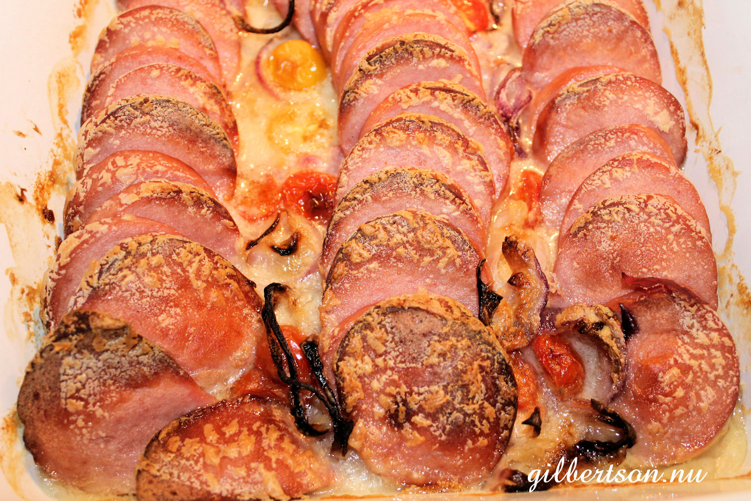 Skiva korven och lägg den i en form. Dela tomat och lök och lägg i formen. Riv pepparrot och rör ned i en burk ifraiche. Smaka av. Jag vill ha mycket pepparrot och tycker att det ska smaka pepparrot, men det är inte alla som uppskattar den styrkan. Bred krämen över falukorven och sätt in i 175 grader i ca 25 minuter.