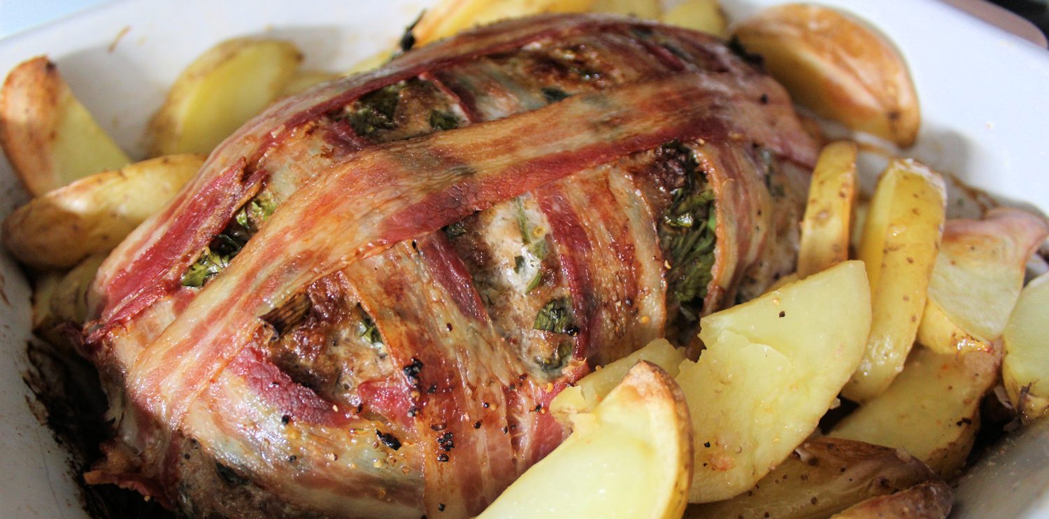 Täck med baconskivor. Dela potatisen. Lägg dem bredvid köttfärslimpan. Salta, peppra och stek köttfärslimpan i nedre halvan av ugnen ca 1 timme.