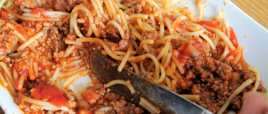 Skala och hacka löken. Bryn i mjölkfritt margarin. Tillsätt köttfärsen och bryn. Krydda med salt, peppar, timjan och krossad vitlöksklyfta och tillsätt de mixade tomaterna. Smaka av med tomatpuré och ketchup. Späd med havredryck till önskad konsistens. Låt såsen puttra ett tag.