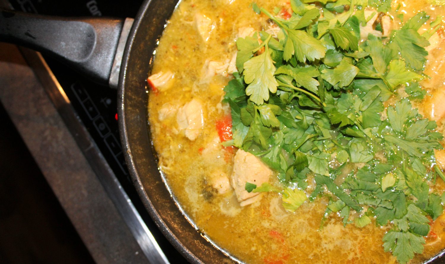 Häll på kokosmjölken och låt grytan bli varm. Smaka av med kycklingfond och lägg i bladpersilja (ett knippe). Rör om och servera med kokt ris.