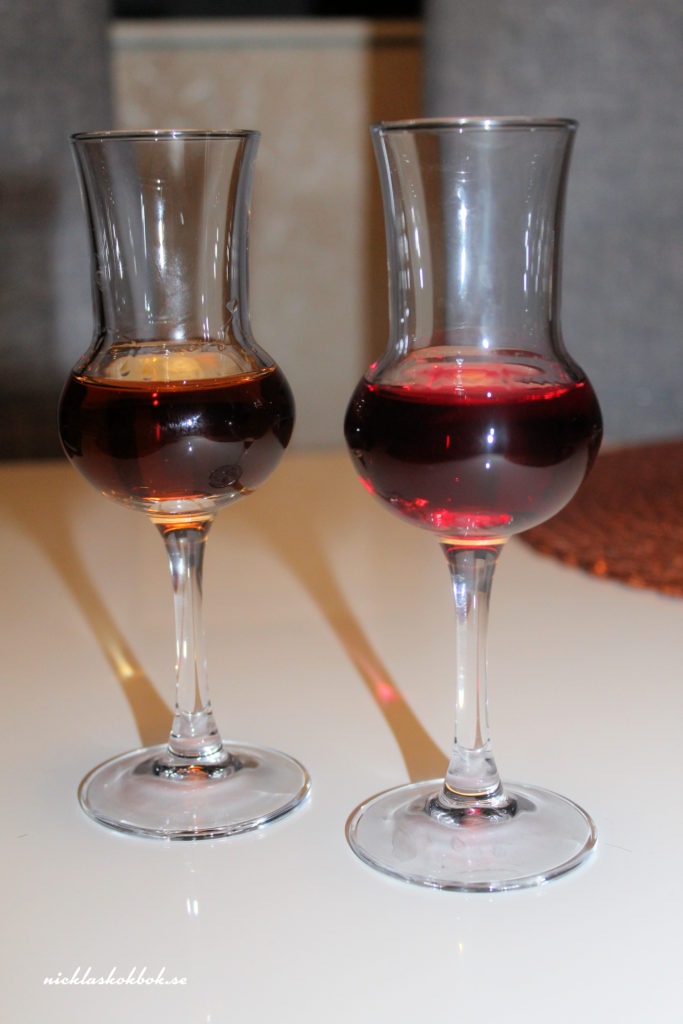 Till vänster körsbärslikör, till höger hallonlikör.