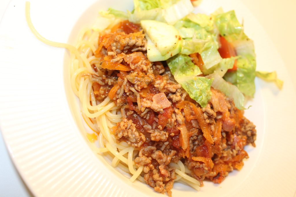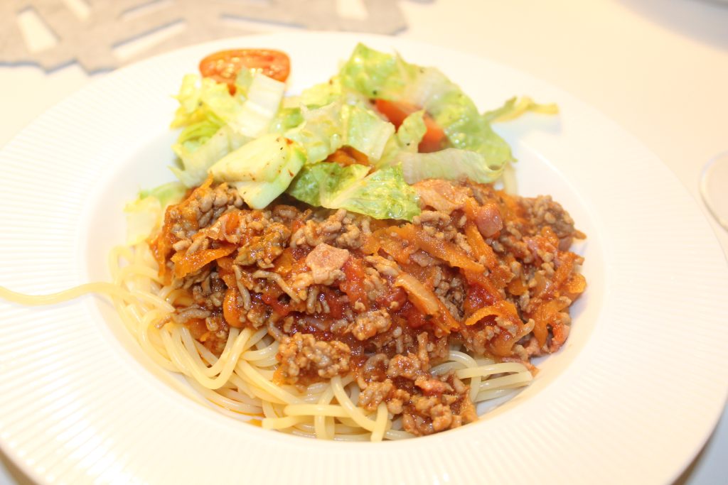 Jag har sedan min hälsoboost startade undvikit kolhydrater men har i veckan haft sådana cravings efter spagetti så ikväll blir det spagetti med köttfärssås. I eftermiddags skickade jag SMS till äkta hälften så innan han kom hem så handlade hem alla ingredienser (han är hemma drygt en timme före mig). Lök, vitlök och bacon steks tillsammans och sedan läggs köttfärs i stekpannan. Där får färsen färg och sedan blandas den med krossade tomater (använd gärna krossade tomater från Mutti) och rivna morötter. Smaksätt gärna med köttbuljong (touch of taste) för smak och pepparmix. Nu ska såsen kokas ihop i ca 1,5 timme.