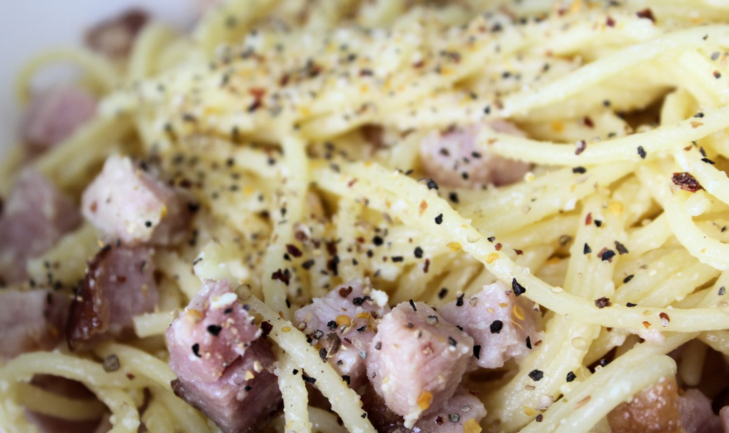 Strimla kassler och lök och bryn det i olja. Häll över den färdigkokta pastan och blanda ned uppvispat ägg. Tillsätt ev veganost. Rör runt tills äggsmeten börjar stelna men fortfarande är krämig.