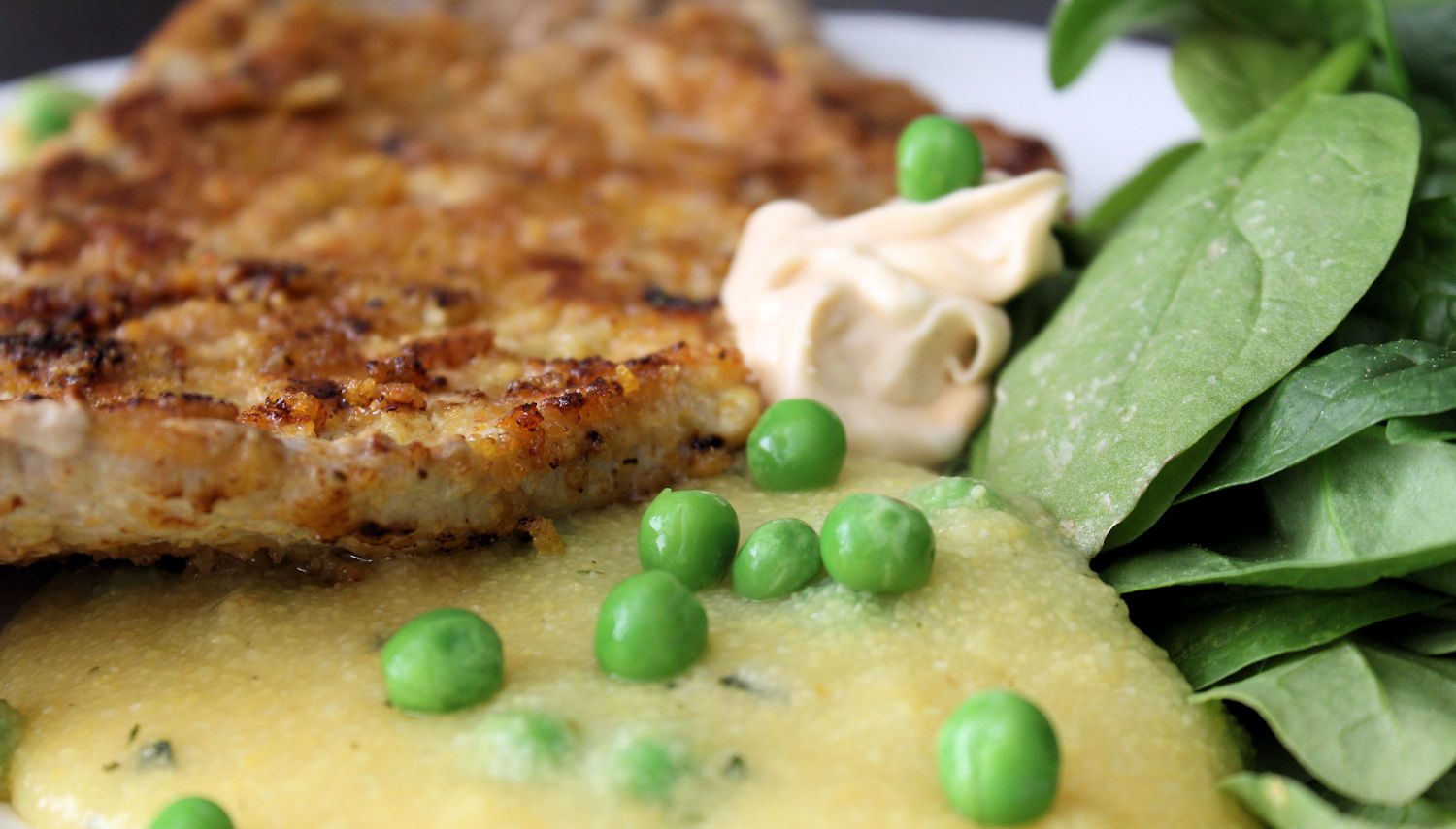 I veckan- tack och lov för helgledighet – så jag får sova och vila – ska äkta hälften och sonen byta golv i uterummet, vilket är välbehövligt. Vi ska ha över goda vänner på middag, jag ska försöka hinna rensa en massa och städa och utöver det blir det bara en massa vila . Att laga mat har legat på en låg nivå men ikväll känner jag att krafterna börjar återvända, så det blev en krämig polenta med gröna ärtor, schnitzel och Sriracha Chili Majonnäs. Mat för en kung.
