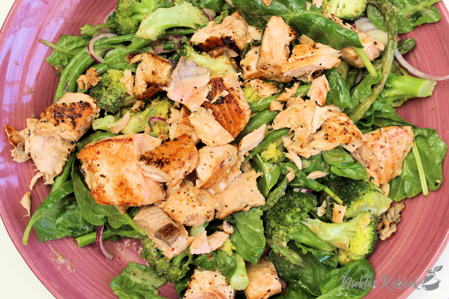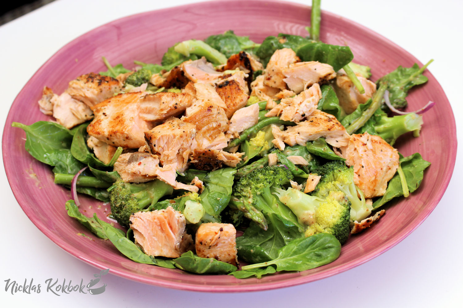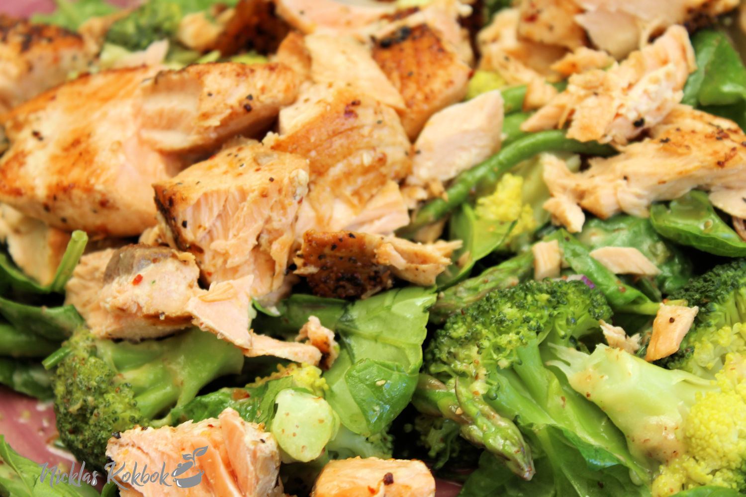 Ju varmare det blir, desto lättare mat lagas här hemma och jag vill tipsa om den här goda rätten. En riktigt matig sallad där grönsaker marinerats i skånsk senap. På toppen lägger man på halstrad lax eller så byter man ut laxen mot kyckling. Kyckling är också gott till senap.