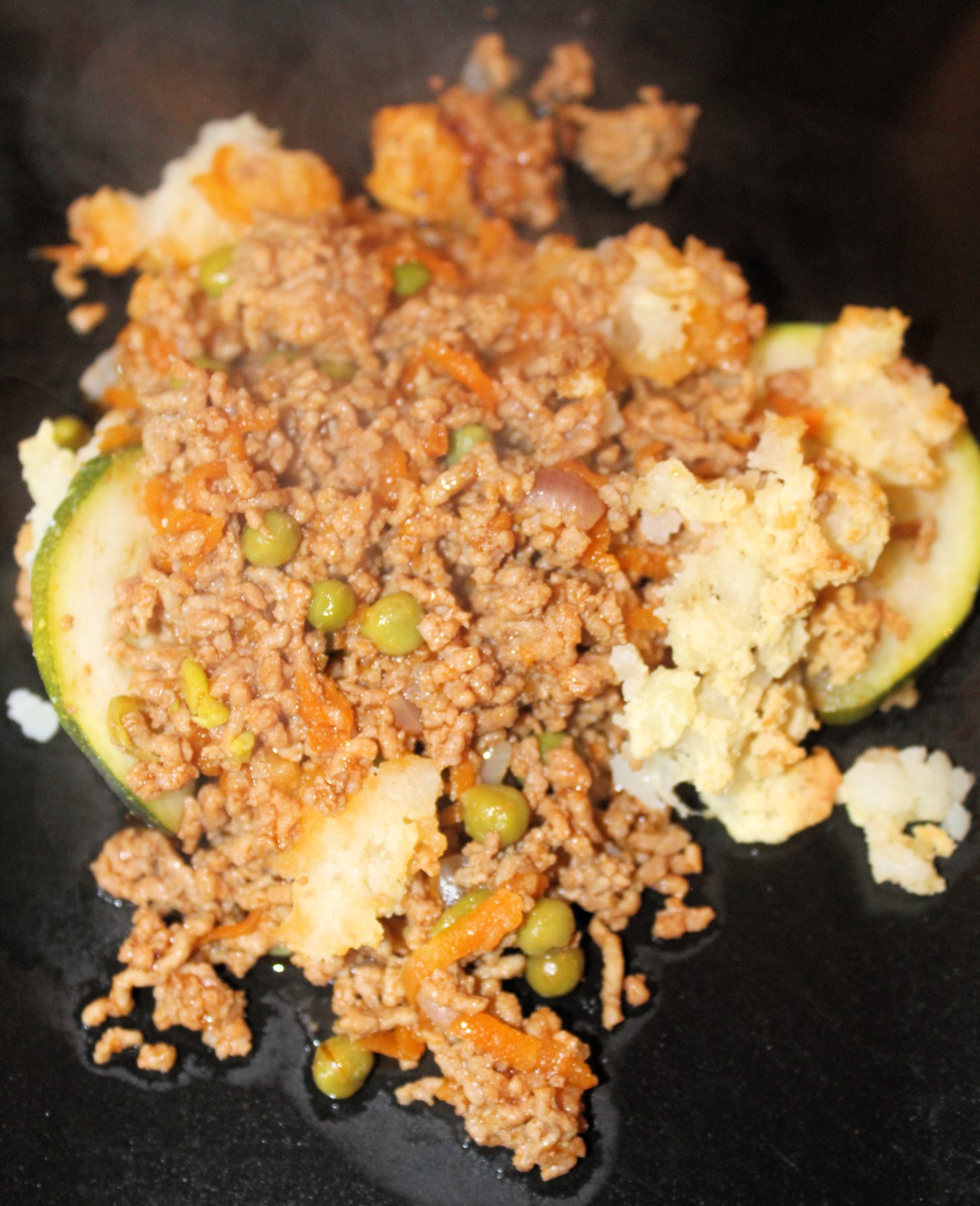 Köttfärsen: Hacka löken och fräs. Vänd i köttfärsen och stek under omrörning tills den får färg. Tillsätt , tomatpuré, riven morot, gröna ärtor, buljong och buljongtärning och rör om. Låt puttra i ca 20 min.