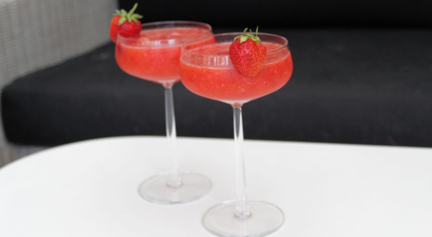 Jordgubbarna mixas tillsammans med sockerlag. Tillsätt limejuice och rom. Blanda väl.